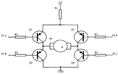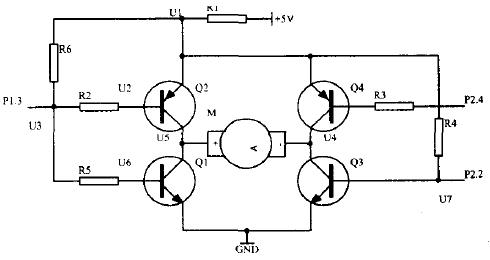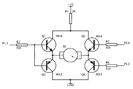 如图1所示.P1.3、P2.2和P2.4分别是51单片机的I/O引脚。原设计的工作原理是:当P1.3高电平、P2.2和P2.4都为低电平时,Q1和Q4导通,Q2和Q3截止,电流流向为+5V→R1→Q1→M→Q4→GND,电动机正转;当P1.3低电平、P2.2和P2.4都为高电平时,Q2和Q3导通,Q1和Q4截止,电流流向为+5V→R1→Q3→M→Q2→GND,电动机反转;当P2.2为高电平,P2.4为低电平时,P1.3不管是高电平还是低电平,电动机电路不通,电动机不转。