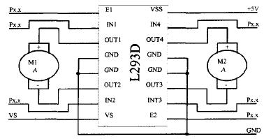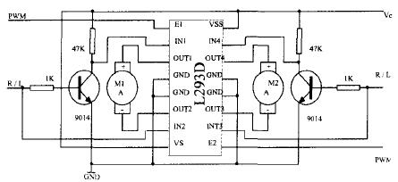 为解决驱动能力和多台电动机驱动.同时兼顾元件数少,近年来微型直流电动机驱动多采用专用集成电路,其中使用L293驱动较为常见,如图7。L293逻辑“0”输入电压为1.5V,可以免除1.5V以下的干扰,内置钳位二极管,支持高达5KHz的开关应用,控制电源与驱动电源分开,51单片机可直接驱动,能同时驱动二台微型直流电动机。