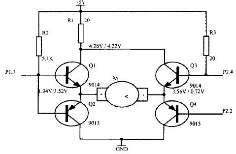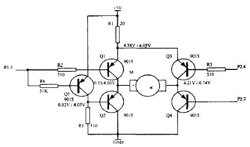 图4与电路一明显不同的是两只NPN管移到了下方,PNP在上方。这样,Q1和Q3的集电极的电位最低可达到一个管压降(0.3V),增加了M的有效电压范围。但为了保证对NPN管的足够的驱动,P1.3和P2.2必须加上拉电阻。图中,R2、R4、R5、R6都不可少.所以这种电路元件的用量比较大。还有,R5应该比R6大几倍,如10倍。当Q1导通时,P1.3处的电压可以分得较高,不至于使Q2导通。否则,如果R5太小或为0,则当Q1导通时,由于P1.3处的电位较低,将使Q2也导通,电路出现故障。经过试验,R2、R3、R4、R6可取510Ω,R1为20Ω,R5取5.1kΩ。实测各处的电压如下:U1:4.04V,U2:2.99V,U3:3.87V,U4:4.00V,U5:0.06V,U7:0.79V。