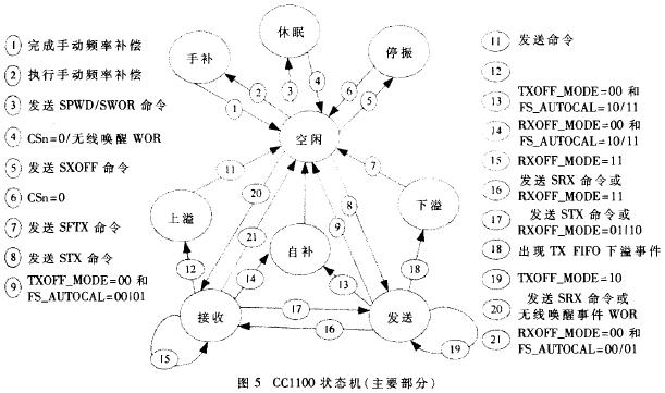 CC1100 内部有一个用于管理各个状态之间相互切换的状态机。当前状态可从状态寄存器MARCSTATE获得。状态转移图如图5所示。命令、内部事件和配置信息决定状态切换。寄存器MCSM1中的TXOFF_MODE、RXOFF_MODE 决定在完成发送操作、接收一个有效的包后将进入哪一个状态。需要注意的是,具有省电功效的无线唤醒功能WOR 能使CC1100在SLEEP状态下周期性地自动转到IDLE 状态,然后再自动转到Rx状态。但如果在此状态下没有数据包可接收,将又回到SLE EP状态;否则,在接收完数据包之后,下一个状态将由RXOFF_MODE决定,但不会进入SLEEP状态, 必须在进入IDLE 状态时由MCU发送SWOR命令才能再次进入。在SLEEP状态下,晶振是否继续工作是由寄存器MCSM0 中的XOSC_FORCE_ON决定的(0:继续工作,1:停止工作)。在MCU访问CC1100(CSn=0)时,无论XOSC_FORCE_ON 为何值,晶振将总是工作。