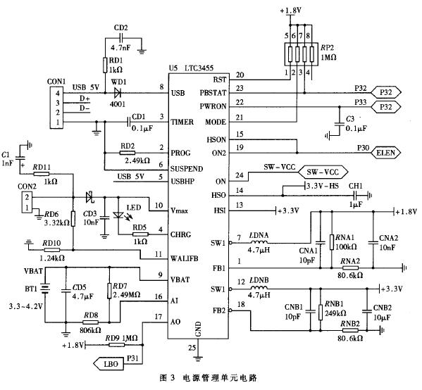 LTC3455是凌特公司针对手持应用新推出的一个完整的单片电源管理解决方案,在4mm×4mm 的24引脚QFN封装内集成了USB电源管理器、锂离子电池充电器和双DC-DC(5V~3.3V和5V~1.8V)转换器,它把以前需要5个或更多芯片实现的几个功能结合在一起。对电源进行无缝选择(3选1),其过程完全是按优先级自动进行的:5.0V AC适配器→USB电源→电池。在使用适配器或USB电源时,电池充电器被使能,而且器件内部的电源完全由选择的外部电源供电。电源管理单元电路图如图3所示。图中的CON1与PC的USB 口相接,CON2与电源适配器相接,USBHP用于选择USB电源的上限电流为500mA。P30用于使能SW2和热插拔功能,P31用于指示电池的电量,P32用于指示ON脚的状态,P33用于使能本芯片,SW-VCC用于开启/关闭输出电源。
