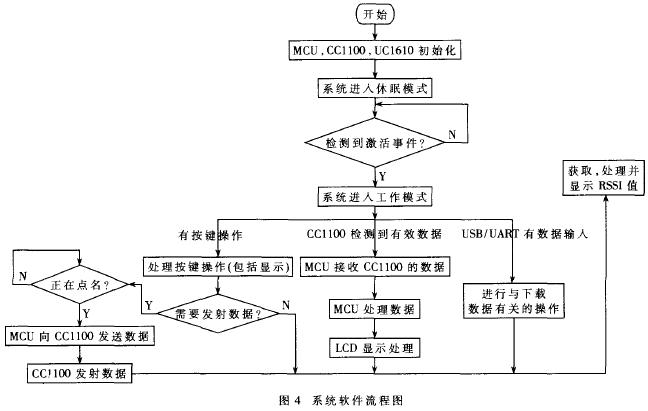 软件的开发环境为keil uVISION3,使用keil C51语言。系统的无线通信部分采用主从结构,从站由手持设备组成,主站由设在厨房的基站组成,工作方式采用主站轮询、从站监听方式。为了避免多个从站争用信道而发生冲突,规定只有主站向某个从站点名时,从站才向主站发送数据。系统软件主要流程如图4所示。