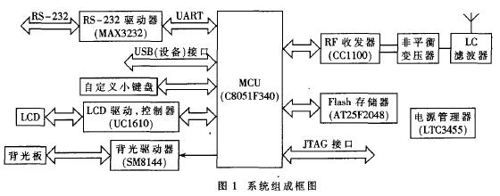 系统组成框图如图1所示。它主要由MCU控制单元(控制各可编程芯片、处理输入和输出信号)、射频收发单元(射频信号的调制与解调、发射与接收和对数据进行打包与解包等)、键盘与LCD显示单元(信息的输入和显示)、存储器单元(存放汉字库和菜单数据库)、UART和USB接口单元(与PC机的通信、提供充电电源)、电源管理单元(为系统提供各种类型的电压、充电、外接电源的切换等)等组成。
