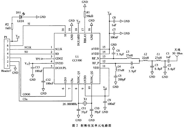 考虑到高频干扰,该单元单独做一块PCB板,并用金属罩对其进行电磁屏蔽,通过一个7针的连接器与底板相连,如图2所示。GDO0与MCU 的P0.7相接,用于指示是否已完整地接收了一个数据包, 它可作为MCU的外部中断源信号。在缺省情况下,GDO0会输出一个频率为晶振频率(192Hz)的方波,这可作为在调试时判断CC1100是否正常工作的依据。SCLK(串行时钟)、SO(串行输出)、SI(串行输入)、CSn(片选)分别与MCU的P0.0、P0.1、P0.2和P0.6相接, 实现MCU与CC1100的SPI接口相连。MCU对CC1100的配置、控制和数据收发都通过该SPI接口进行。在设计PCB时要让晶振与芯片引脚尽量靠近,并用地线把时钟区隔离开,晶振外壳接地并固定,元件都使用SMT(表帖式)元件,以减少过孔和体积。Vcc为3.3V。C4、C5、C6和L3、L4组成一个非平衡变压器,用于在差分和单端RF(射频)信号之间进行变换,C1、C2、C3和L1、L2组成一个LC滤波器, 它与非平衡变压器一起实现与50Ω的天线相适配。电阻R1用于为CC1100的偏压设置一个精准的参考电流。DS1用于指示模块上的电源是否正常。