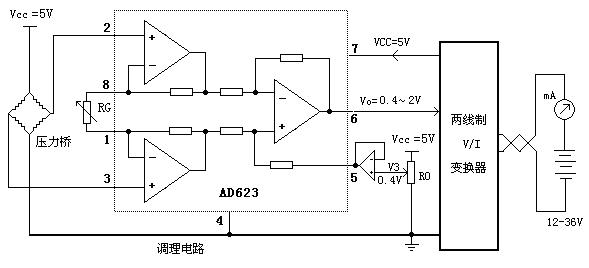 R0将0.4V叠加在AD623的REF脚(5脚)上,在压力=0情况下通过调整R0使输出4mA,再调整RG输出20.00mA,完成校准。