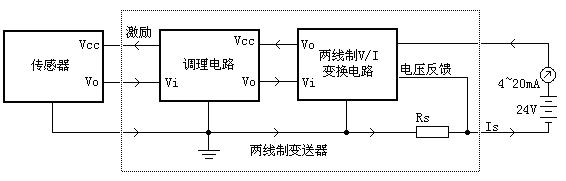 从整体结构上来看,两线制变送器由三大部分组成:传感器、调理电路、两线制V/I变换器构成。传感器将温度、压力等物理量转化为电参量,调理电路将传感器输出的微弱或非线性的电信号进行放大、调理、转化为线性的电压输出。两线制V/I变换电路根据信号调理电路的输出控制总体耗电电流;同时从环路上获得电压并稳压,供调理电路和传感器使用。