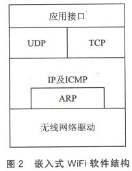在WinCE、Linux等操作系统环境下,可以使用厂家提供的设备驱动来使用WiFi网卡。这种系统一般对硬件资源(如CPU性能、存储器容量等)有较高的要求。对于许多嵌入式应用,由于硬件资源的限制,很多系统都在简单OS(如uC/0S等)或无0S的环境下运行,这时就需要对整个软件协议作适当的裁减。图2是嵌入式WiFi的软件结构。