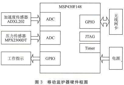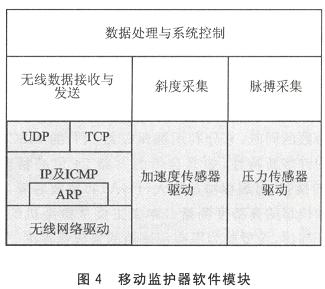 图3中,移动监护器的硬件结构包括电源模块、压力传感器模块、加速度传感器模块和无线网卡模块。