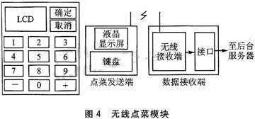 - 数据传输:通过无线发送/接收终端将点菜数据无线发送上传给服务器.