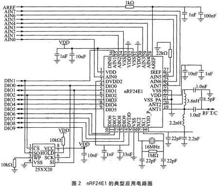 图2为nRF24E1的典型应用电路.从图中看到,采用Nordic nRF24E1无线单片机芯片设计的线路非常简单,外围零件很少,也非常容易进行设计开发.