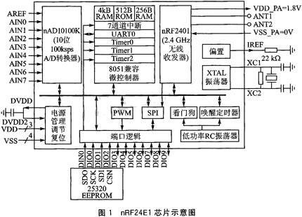 从图1可以看到,nRF24E1由1个8051微控制器内核和1个nRF2401无线收发芯片等组成.芯片包括:增强型8051内核、无线收发器nRF2401、9路l00ksps的10位A/D转换器、UART异步串口、SPI接口、PWM输出、RC振荡器、看门狗和唤醒定时器以及内置的专门稳压电路等.