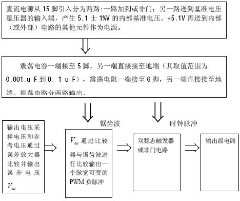 e 脉冲输出级电路:输出末级采用推挽输出电路,驱动场效应功率管时关断速度更快.11 脚和14 脚相位相差180°,拉电流和灌电流峰值达200mA。由于存在开闭滞后,使输出和吸收间出现重迭导通。在重迭处有一个电流尖脉冲,起持续时间约为100ns。可以在13 脚处接一个约0.1uf 的电容滤去电压尖峰。