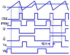 d PWM 信号产生及分相电路: 比较器的反相端接误差放大器的输出信号ue,而振荡器的输出信号uc 则加到比较器的同相输入端,比较器的输出信号为PWM 信号,该信号经锁存器锁存,分相电路由二进制计数器和两个或非门构成,其输入信号为振荡器的时钟信号,并用时钟信号的前沿触发,输出为频率减半的互补方波,这些方波和PWM 信号输入到或非门逻辑电路。其结果是,所有的输入为负时,输出为正。这样P1、P2的输出每半周期交替为正,其宽度和PWM 信号的负脉冲相等。脉冲很窄的时钟信号输入到逻辑或非门电路,可使两个门的输出同时有一段低电平,以产生死区时间。