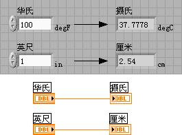 不同体系之间的单位不能够进行运算或者互相赋值,例如“1米等于多少克?”之类的驴唇不对马嘴的换算,这些都能够被LabVIEW自动检出并报错。而相同体系下的单位,通过直接赋值,就可以进行直接的转换,例如“100华氏度等于多少摄氏度?”、“1英尺等于多少厘米?”这样的问题,用如图1的程序就可以轻松解决,在指定好数据的单位后,只需一条简单的连线即可。