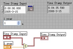 对于时间戳型(Time Stamp)的数据,可以与带有时间单位的数据直接进行运算,非常人性化。LabVIEW中可支持的时间单位有:年(a)、日(d)、小时(h)、分(min)、秒(s)。例如图2的程序计算的是1星期后的日期。