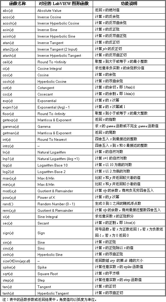下面两张表参考了LabVIEW帮助文档,汇总了公式节点和表达式节点所支持的函数和运算符。