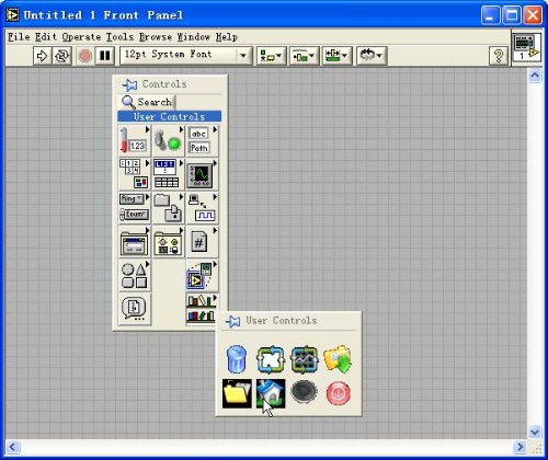 8. 告成!重新启动LabVIEW,就可直接从Controls Palette->User Controls中添加自己制作的图片按钮,如图7所示。如果排列一排相同大小的按钮,并添加Controls Palette->Decorations中某些类型的Box为背景,还可达到类似于工具条Toolbar的效果。