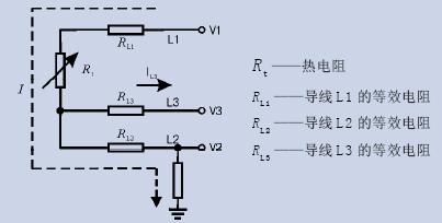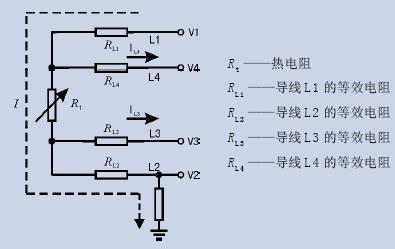 如图1。变送器通过导线L1、L2给热电阻施加激励电流I,测得电势V1、V2。