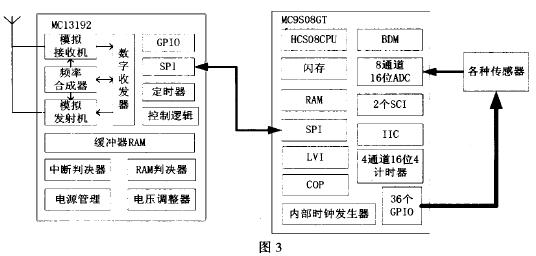 ZigBee-Ready平台解决方案传感器应用的框图如图3所示。在图示的例子中,MCU选择的是MC9S08GT16,其性能道访问;可选的带信标的超帧结构;有保证的时间槽(GTS)机制。