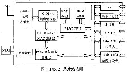 车载子节点安装于车辆内部,传感器元件用于采集车内的信息,在MCU进行简单整理后通过ZigBee收发机、天线传输给采集设备。车载子节点的硬件设计采用Jennic公司的JN5121,它是一款适应低耗能、低成本IEEE802.15.4的无线微控制器。该微处理器包括一个32比特芯片RISC核;一个非常适合2.4GHz频段的IEEE802.15.4收发机;64KB的ROM和96KB的RAM;提供多种低成本的无线传感器网络应用的解决方案。特别的是,该RAM在没有额外记忆设备的情况下.允许支持路由器和控制器能力。为了进一步的降低成本,JN5121使用MAC加速器和高级加密标准AES加速器,同时提供休眠振荡器和能量保留工具,减低了系统能量消耗。该设备也能兼容大范围的数字和逻辑外围设备。由于该芯片集成了MUC和RF收发机.只需要对该微处理器外围电路进行适当的配置.就可以直接作为ZigBee车载子节点,安装于车内。整个ZigBee节点的功耗很低.供电设备要求不高,普通的AA电池可用2年以上。此系统需要供电10年以上,节点可采用车内电源直接供电。节点的JN5121芯片结构如图4所示。