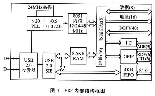 CY7C68013是Cypress公司的EZ-USB FX2系列芯片。EZ-USB FX2是一款集成USB2.0收发器的微控制器,内部结构如图1所示。该系列芯片集成了USB2.0收发器、串行接口引擎(SIE)、带8.5KB片上RAM的增强型高速8051单片机、4KB FIFO存储器以及通用可编程接口等模块.提供了全面集成的USB解决方案,无需外加芯片即可实现高速USB传输。FX2系列芯片最主要的特点是可以通过USB2.0的通用可编程接口为特定的应用接口编程。另外,CY7C68013的GPIF引擎具有自动传输数据结构的特性,这种特性使得以主/从端点FIFO(8/16位数据总线)为ATA、UTOPIA、EPP、PCMCIA、DSP等的外围设备,可以与主机通过CY7C68013无缝、高速地传输数据。另外,CY7C68013内部集成的USB2.0的SIF能完成大部分USB2.0协议的处理工作,从而减少了用户对繁杂的USB协议的处理。