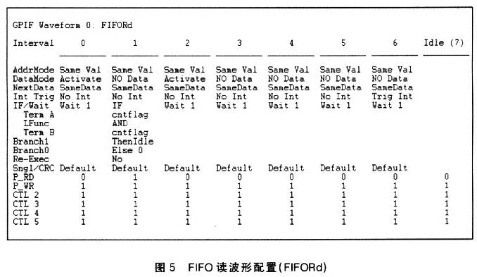 在GPIF高速数据传输中,GPIF波形的描述符决定了整个数据传输过程的时序。GPIF波形描述符通常用Cypress公司的GPIF工具(GPIFTOOL)进行配置。它是一个可运行于Windows平台的应用程序,与FX2的开发包一起发布的。在GPIF方式下,所有的读/写及控制逻辑通过CY7C68013的GPIF以软件编程的方式实现,且控制逻辑的变换方便灵活(只需要改变接口的一个配置寄存器的值)。
