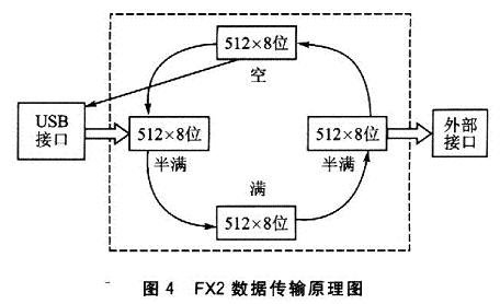 当前操作的FIFO写“满”时,FX2自动将其转换到外部接口端,排除等候读取;并将USB接口队列中下一个为“空”的FIFO转移到USB接口上,供其继续写数据。同时,在外部接口端看来,只要有1个FIFO为“半满”,就可以继续读取数据。当前操作的FIFO读“空”时,FX2自动将其转换到USB接口端,排除等候写入;并将外部接口队列中下一个为“满”的FIFO转移到外部接口上,供其继续读取数据。