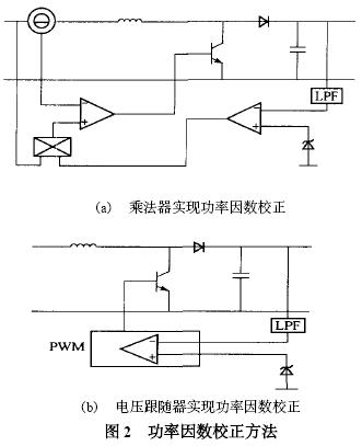功率因数校正主要有两种方法:一种是将电网上公用负载端并接一个专用的功率变换器,对无功和谐波进行补偿;另一种是将负载的整流电路与滤波电容之间增加一个功率变换电路,将输入电流校正成与电网电压相近的正弦波。实现功率因数校正在CCM 和DCM下可采用乘法器和电压跟随器实现,框图如图2所示。