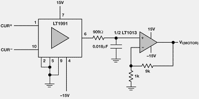 图2: LT1995和一对LT1632,直流电机的动态电压范围达±50V。