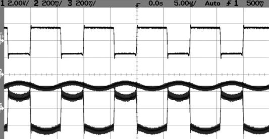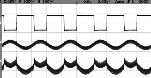 图6b: 大电机电阻,占空比60%、感应电阻0.1Ω。轨线1是电压。轨线2为电流,轨线3为瞬时功率。