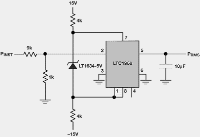 瞬时功率波形衰减十倍,并输入到LTC1968,这样直流输出与RMS功率成正比(图5)。
