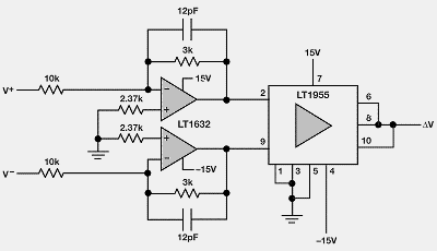 图3: LT1991测量小感应电阻的电压,共模输入摆动范围达±60V。