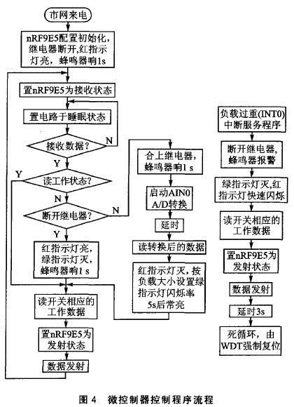 要实现上述控制数据帧通信功能,需要对nRF9E5进行初始化配置和用户程序设计。程序采用中断接收,按需发送。发送和接收程序流程如图4所示。有一个收发主程序,市网来电先使nRF9E5配置初始化,再进入正常中断接收、按需发送工作。有两个中断服务程序:一个是当取样电阻压降过大时,引起Q6反转,表明负载过重,切断继电器,同时触发INT0中断服务程序,蜂鸣器报警,绿灯灭,红灯以16 Hz(最高)频率闪烁,微控制器读开关相应的工作数据,把过载的情况发送出去,随后进入死循环,由WDT溢出强制复位;另一个中断服务程序是手动开关K1(或K2、K3)引起的触发INT1中断,相当于射频接收到了遥控数据,完成射频接收一样的工作流程。