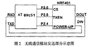 本系统的无线通信模块在单片机的控制下分为与发送和接收两部分,其中发送部分是由单片机在采得数据以后通过单片机串行口送到模块由模块发送,而接收部分是由模块接收到数据以后,由单片机控制通过通用串行总线发送给计算机。这两部分的连接示意图如图2所示。 图2无线通信模块发送部分示意图无线接收模块部分NRF401和AT89C51的连线与发射端是相同的。