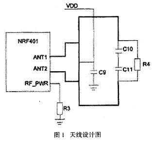 天线对无线传输设备的性能有着很大的影响,系统中,ANTI和ANT2是NRF401接收时的输入,以及发送时功率输出器的输出。连接到nRF401的天线是以差分的方式连接的,在天线端的负载阻抗是400Ω。