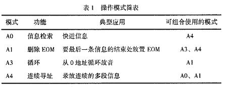 ISD1420系列内置了若干操作模式,可用最少的外围器件实现最多的功能。操作模式也由地址端控制;当A7和A6都为1时,其它地址端置高就选择某个(或某几个)模式。因为操作模式和直接寻址互相排斥。操作模式可由微控制器,也可由硬件实现。使用操作模式有两点注意:1)所有操作最初都是从0地址,即存储空间的起始端开始。后续操作根据所选用的模式可从其它的地址开始。此外,A4模式中,当电路由录转为放时地址计数器复位为0,而由放转为录则不复位。2)当控制信号(/PLAYL、/PLAYE或/REC)变低,同时A6和A7为高时,执行操作模式。这种操作模式一直有效,除非控制信号再次由高变低,芯片重新锁存当前的地址/模式端电平,然后执行相应操作见表1。