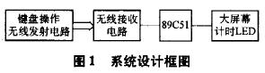 篮球比赛中除了有每一节(或上、下半场)时间倒计时外,为了加快比赛的节奏,使比赛更加激烈精彩,比赛规则还要求进攻方应在24 s内有一次投篮动作,否则视为违例。比赛计时系统要求用大屏幕挂在高处,控制按键在计时员旁边,现在常见的计时系统大多采用有线传输方式,需要很长的传输线,既不美观也不便安装。为此,我们设计了一套利用编、解码器和射频模块进行无线数据传输的篮球比赛系统,采用单片机控制,按键操作使用简洁,大型LED(液晶显示器)显示,安装方便。系统设计框图见图1。
