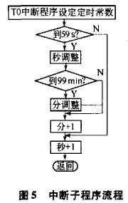 PT2272将接收来的信号送入89C51,转变为相应的按键指令,利用串行通信口TXD 和RXD通过74LS595(带三态的8位移位寄存器)输出显示的字段,每位显示完以后,进行锁存输出,可以避免显示的闪烁现象(前2位显示24 s的计时,后4位显示总的计时分、秒)。总计时分、秒的工作采用T0定时器工作于中断方式,建立一个中断服务程序,24 s采用T1定时器工作于中断方式,也建立一个中断服务程序,在内部RAM单元的7CH中放24 s的显示值,7DH中存放总计时的分钟数,7EH中存放总计时的秒值。显示大屏幕采用LED1~LED6,利用24 V供电,74LS595与LED之间采用三极管作为功率放大电路,以驱动大尺寸高电压大电流的LED。流程见图4和图5。