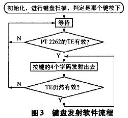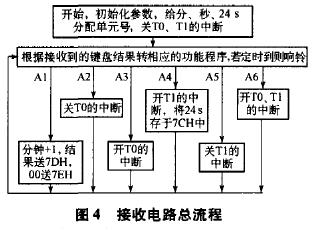 键盘发射电路采用内置2 kB Flash ROM 的89C2051,采用6 MHz晶振做振荡源,用P1口的6个口作为键盘输入,分别为+1键A1(软件设计时让此键连续按住4 s以上为连续+1)进行比赛时间的设定,暂停键A2可控制总计时和24 s暂停,A3作为总计时的工作开启键,A4作为启动24 s键,投篮或交换控球时按此键,按下此键后开始24 s计时,A5作为24 s的停止键(还没有违例),A6作为总计时和24 s的同时启动键。工作时程序将A1-A6分别转化为0001~0110。经P3.2~P3.5送到PT2262的信号输入端。经DOUT输出到F05C,发射出去。流程见图3。