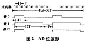 PT2262编码器采用DIP18封装,OSC(振荡器)端外接一个振荡电阻,DOUT为输出端,输出地址码及数据码(由不同的脉宽组成的脉冲串),一般经射频电路以RF方式由天线发射出去。PT2262引脚A0-A7地址码是三态的,可置“0”或“1”或“悬空”。相应输出的信号是两个不同宽度的脉冲,称为AD位(见图2),可编成多种不同的地址码(不易重码或破译)。编码位结构是编码信号的基本组成部分,它就是一个编码字,一个编码位有12个AD位(地址在前数据在后)和后面的SYNC位(带有1/8位波长的4位波长的波)组成,一个码周期有4个连续的编码字。一旦PT2262检测到TE端置“0”,DOUT引脚就有编码信号输出。振荡器的工作频率取决于外接电阻的阻值。