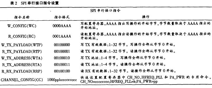 PTR8000有4种工作模式:掉电模式、待机模式、接受和发射模式,掉电模式下所有电路关闭,不能发射和接受,但是可以与控制器进行SPI操作、TRX_CE和TX_EN进入最省电状态,电流仅为2.5 A;待机模式下,发射接受电路关闭,只有SPI接口工作,电流为40u A;待机和掉电模式下,均不能收发,但是可以配置。SPI的配置指令如表2所示。