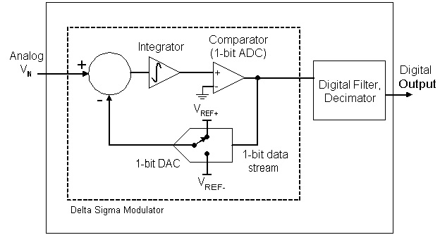 图 1:增量累加 ADC 由执行模数转换的增量累加调制器及其后的数字滤波器和抽取器组成