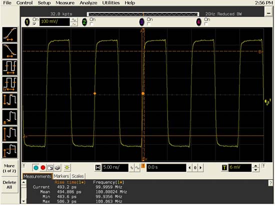 从图中可以看出,该示波器主要只通过了该时钟信号的100MHz基本频率成分,因此,时钟信号显示出来大约是正弦波的形状。带宽为100MHz的示波器对许多时钟速率在10MHz 到 20MHz 范围的基于MCU的8bit设计而言可能非常合适,但对于这里测量的100MHz的时钟信号就明显不够了。 图4给出了利用Agilent公司500MHz带宽的示波器MSO6054A测量同一信号的结果。
