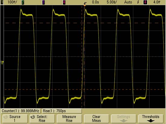 图3给出了利用Agilent 公司带宽为100MHz的示波器 MSO6014A测量一个边沿速度为500ps(从10%到90%)的100MHz数字时钟信号得到的波形结果。