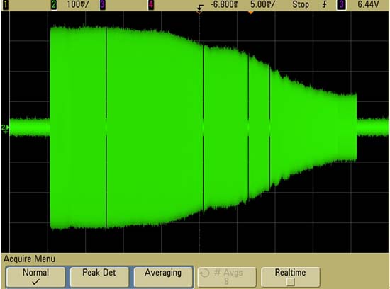 换用Agilent1-GHz带宽的示波器MSO6104A之后,我们得到的信号图像(见图5)就更准确了。