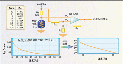 有时需要对热敏电阻的输入进行标定以便得到合适的温度分辨率,图3是一个将10~40℃温度范围扩展到ADC整个0~5V输入区间的电路。