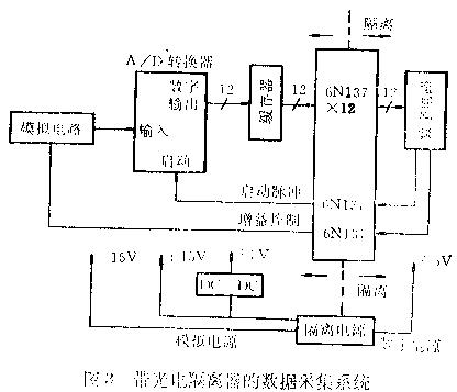 本所研制的机载三通道红外成像扫描仪的数据采集系统,要求信噪比1000,12位量化级别,并行数据传输,数据传输率500KB/s。要达到上述要求,AD能否达到转换精度是个关键。在未采用光电隔离器的电路中,虽采取了一系列措施,但因各模块间地线相连,数字电路中尖峰噪声影响仍很大,系统信噪比仅达500.故我们采用6N137将模拟电路及AD变换器和数字电路彻底隔离,电路如图3所示。