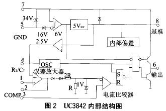 UC3842芯片是Unitrode公司的产品,是一种高性能的单端输出式电流控制型脉宽调制器芯片。其原理框图如图2所示。
