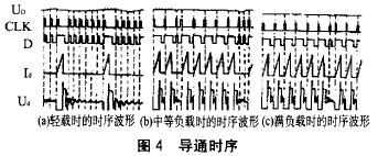如图4所示,在负载不同的时候,其时序电路是不一样的。在满载时绝大多数始终周期是导通的,也就是导通的频率高,中等负载会跳过一部分始终周期,而轻载时要跳过大部分的始终电路,只有少数始终周期是导通的,这样导通周期的频率是很低的。图中,Uo是输出电压,CLK是UC3842的基准脉冲,D是UC3842的输出脉冲,Id是流过开关管的电流,Ud是变压器初级绕组下端(开关管MOSFET漏级)的电压。