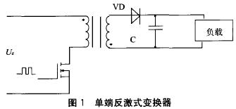 单端反激式变换的典型结构如图1。单端是指变压器的磁心仅工作在磁滞回线的一侧;反激是指当开关管导通时,在初级线圈中储存能量,而次级线圈不通;当开关管关闭的时候,初级线圈中的能量通过次级线圈释放给负载。这是一种成本低的调整器,可以做到输入输出部分的完全隔离,有较好的电压调整率。
